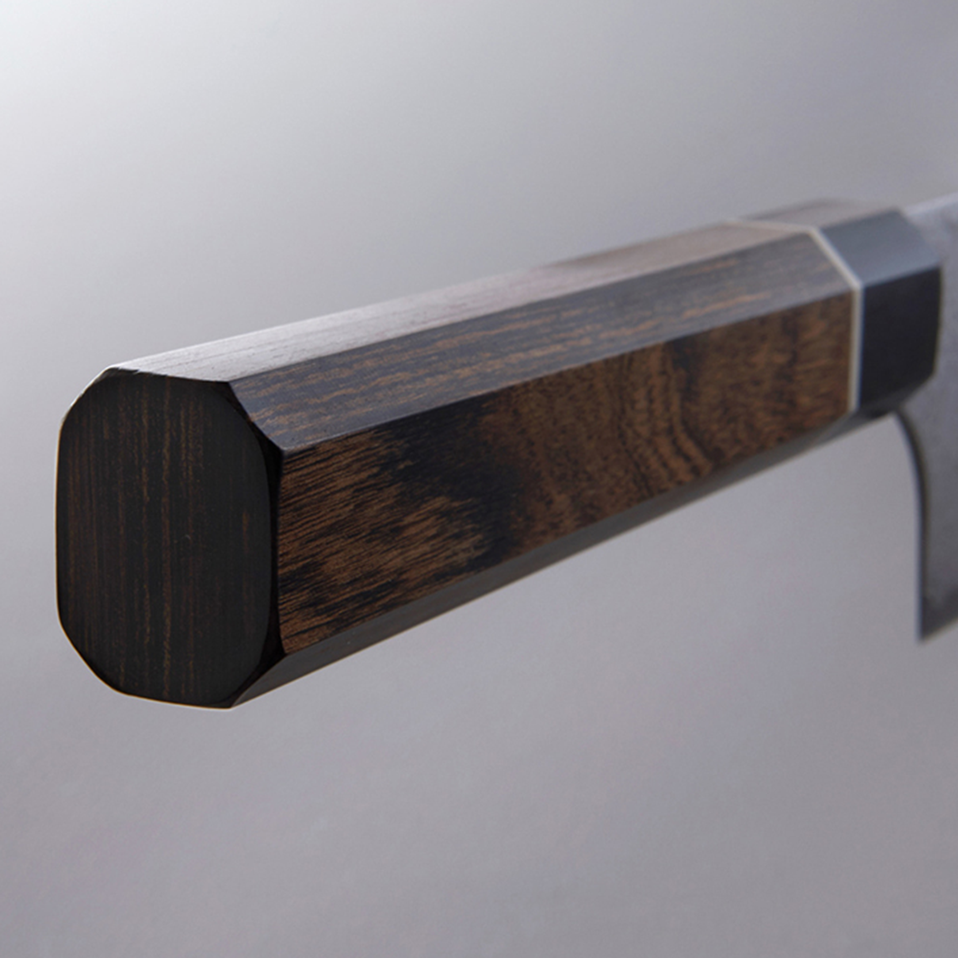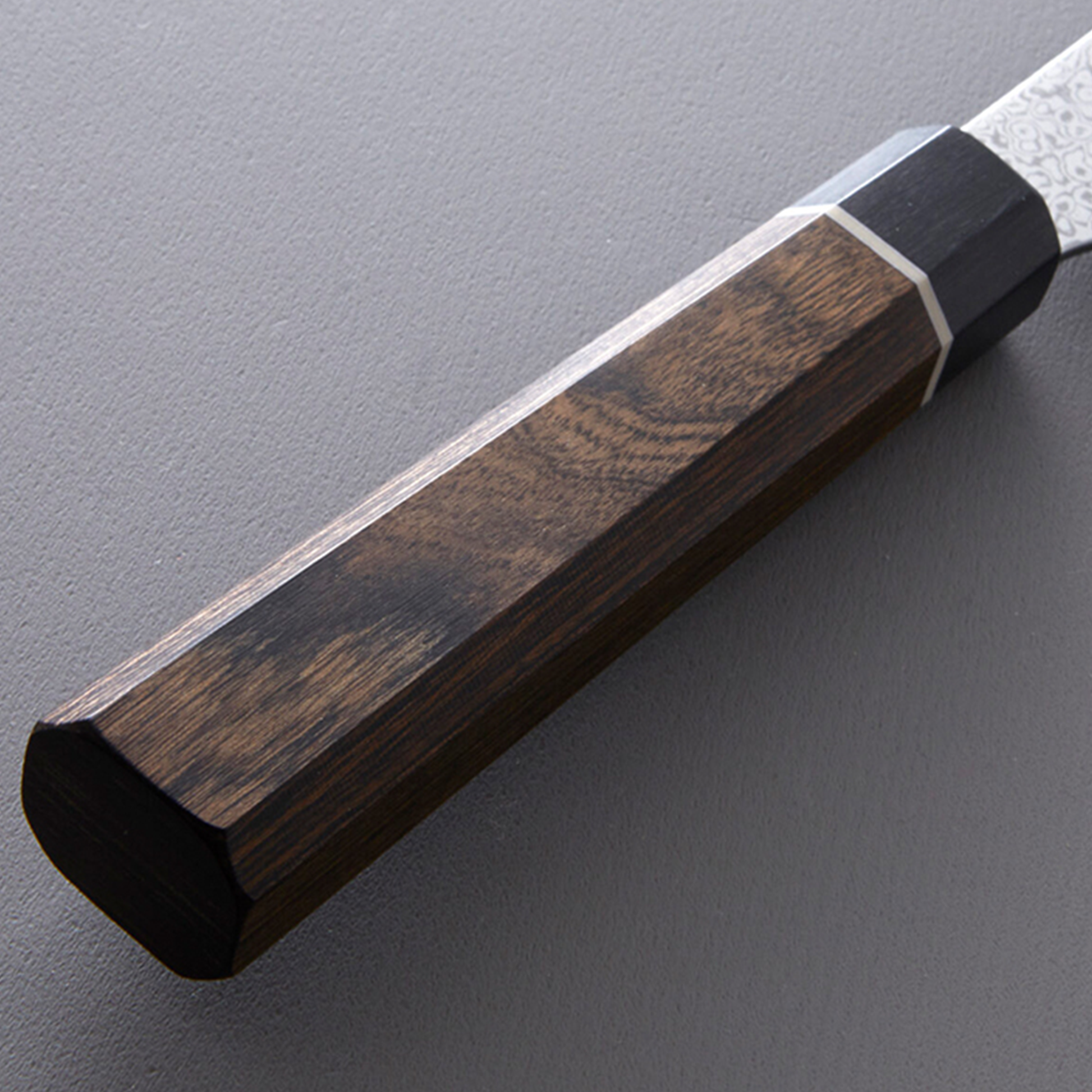 Die Klingen der Suncraft Black Serie, aus Damaszenerstahl hat ein schönes Wellenmuster und das als Kernmaterial verwendete VG10 ist der Schlüssel für die Schärfe und Langlebigkeit der Klinge. Darüber hinaus verleiht die schwarze Behandlung des Damastes den Klingen ein schickes und dezentes Aussehen.Wie in der traditionellen japanischen Messertradition ist der Griff achteckig. Er liegt gut in der Hand und lässt sich ohne Abrutschen festhalten.Das Material ist laminiertes, verstärktes Holz. Dieses Material wird aus natürlichem Holz hergestellt, das in Harz getränkt wurde, um es haltbarer zu machen. Traditionelles Aussehen in Braun und Schwarz mit weißen Faserring-Akzenten.
