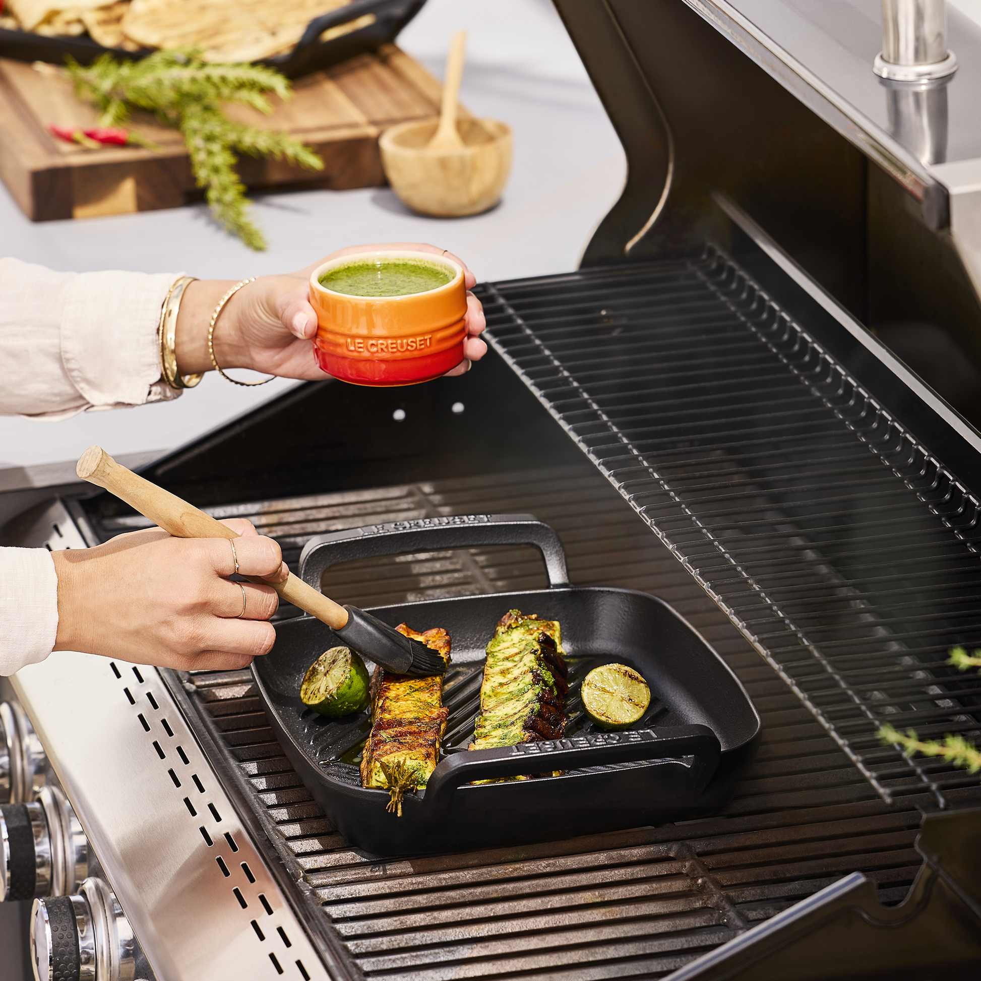 Gehen Sie mit dem BBQ Square Grill über die Küche hinaus – ideal zum Kochen mit offener Flamme. Mit geteilten Kochbereichen können Sie verschiedene Speisen gleichzeitig zubereiten. Die vertikale Rippenstruktur entfernt überschüssige Fette für gesünderes Kochen und ist somit ideal für zartes Fleisch und Fisch.